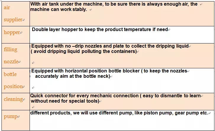 Tento stroj je špeciálne vyrobený pre všetky druhy viskozity / kvapaliny v potravinárskom priemysle, chemickom priemysle a komoditách, ako je motorový olej, motorový olej, šalát, gél na umývanie rúk, kokosový olej, sójová omáčka, sezam, šampón, tekuté mydlo, motorový olej. , brzdový olej, kuchynský olej, paradajková omáčka, nápoj, éterický olej, rastlinný olej, med, korenie, arašidové maslo, jogurt, džús, nápoj atď. Všetka časť, ktorá sa dostala do kontaktu s kvapalinou / omáčkou, je vysokokvalitná nehrdzavejúca oceľ. Stroj používa piestové čerpadlo na plnenie.Nastavením polohového čerpadla môže naplniť všetky fľaše v jednom plniacom stroji, s rýchlou rýchlosťou a vysokou presnosťou.