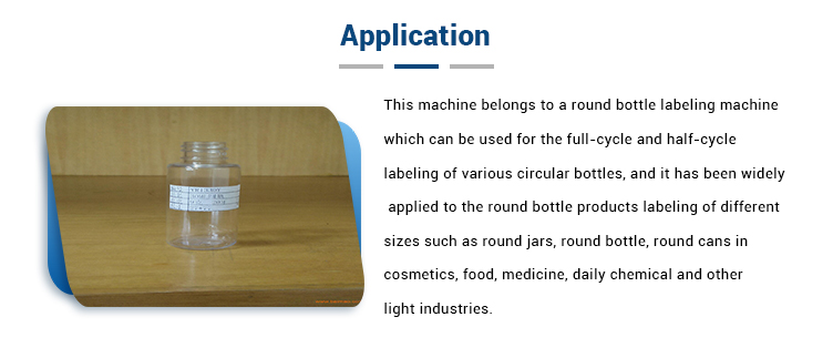 Tento stroj patrí k označovaciemu zariadeniu s okrúhlymi fľašami, ktoré sa dá použiť na označovanie rôznych okrúhlych fliaš v cykloch a v polovičnom cykle, a bol široko používaný pri označovaní výrobkov s okrúhlymi fľašami rôznych veľkostí, ako sú okrúhle nádoby, okrúhle fľaše. , okrúhle plechovky v kozmetike, potravinárstve, medicíne, dennom chemickom a inom ľahkom priemysle. Zloženie zariadenia: elektrická skrinka, dopravný mechanizmus, zariadenie s oddelenou fľašou, zariadenie na štítkovanie na valcoch, zariadenie na štetce, štítkovací motor, operačný systém a riadiaci systém.